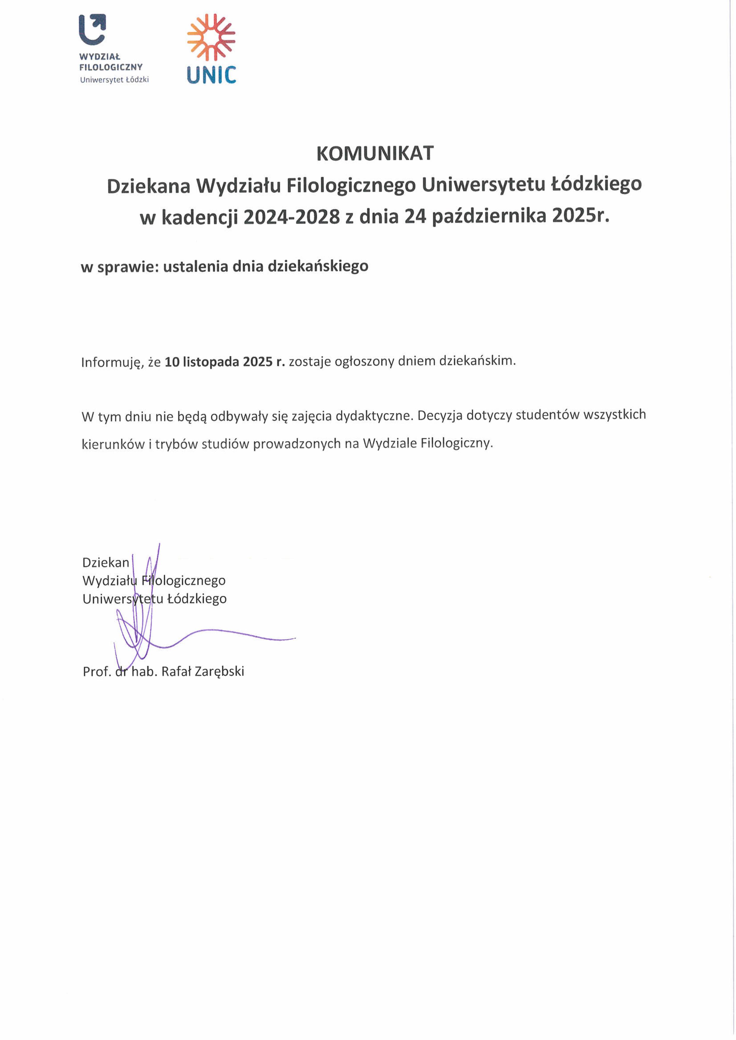 Przesyłam komunikat Dziekana, zgodnie z którym poniedziałek 10 listopada br. ustanowiony został dniem wolnym od zajęć dydaktycznych.