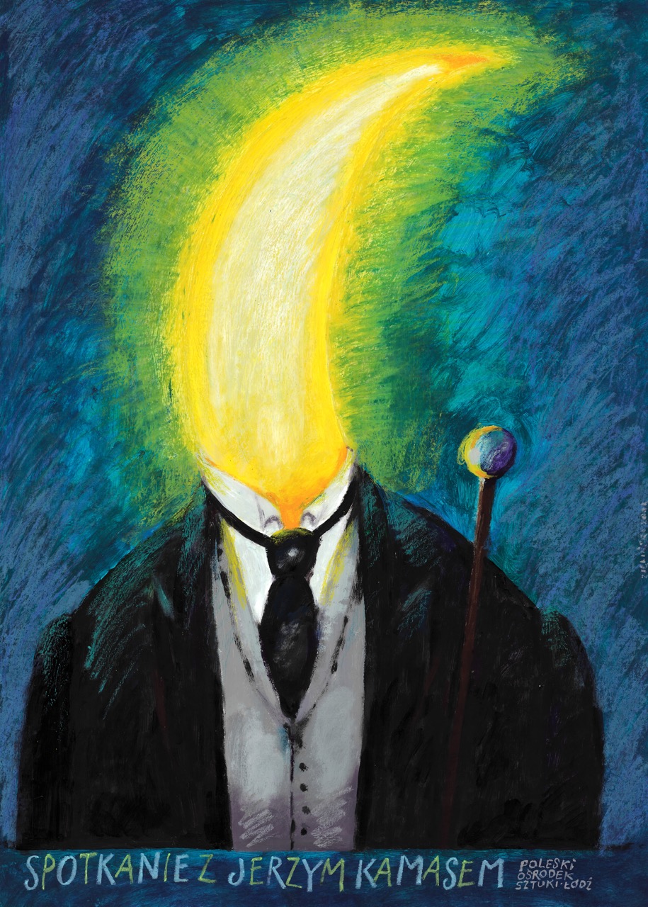 Ten tajemniczy plakat Jana Zielińskiego anonsował spotkanie z Jerzym Kamasem [1938–2015] w Poleskim Ośrodku Sztuki w 2002 roku. Wieczór miał niezwykły przebieg. Okazał się między innymi pretekstem do sentymentalnych wspomnień, ponieważ aktor był Łodzianinem, a także lata nauki zawodu spędził w Państwowej Wyższej Szkoły Filmowej, Telewizyjnej i Teatralnej im. Leona Schillera w Łodzi. Artysta przygotował nawet specjalny program na tę okazję – deklamował wówczas ballady i bajki Adama Mickiewicza oraz „Zaczarowaną dorożkę” Konstantego Ildefonsa Gałczyńskiego[1].