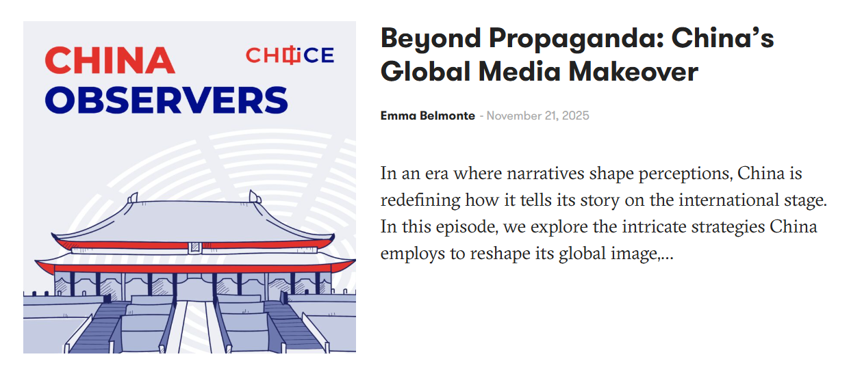Joanna Nawrotkiewicz wzięła udział w odcinku podcastu China Observers in Central and Eastern Europe (CHOICE) poświęconego współczesnym strategiom komunikacyjnym Chin. Dyskusja dotyczyła sposobów, w jakie Chiny kształtują swój wizerunek na arenie międzynarodowej – od tradycyjnej propagandy po bardziej angażujące treści dostosowane do odbiorców lokalnych. Gościem odcinka był także Dr David O'Brien z Uniwersytetu Jagiellońskiego, z którym mgr Nawrotkiewicz współpracowała przy projekcie POLONEZ-BIS-2 finansowanym przez NCN.